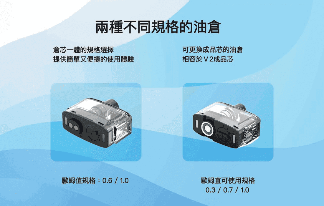 兼容多款設備,Pod空煙彈0.6 、1.0 ,另外提供支援 Dot AIO Coil 0.3、0.7 和 0.9 歐姆成品芯版可替換空倉(需另購),滿足不同口感偏好,更不怕耗材缺貨空窗期!