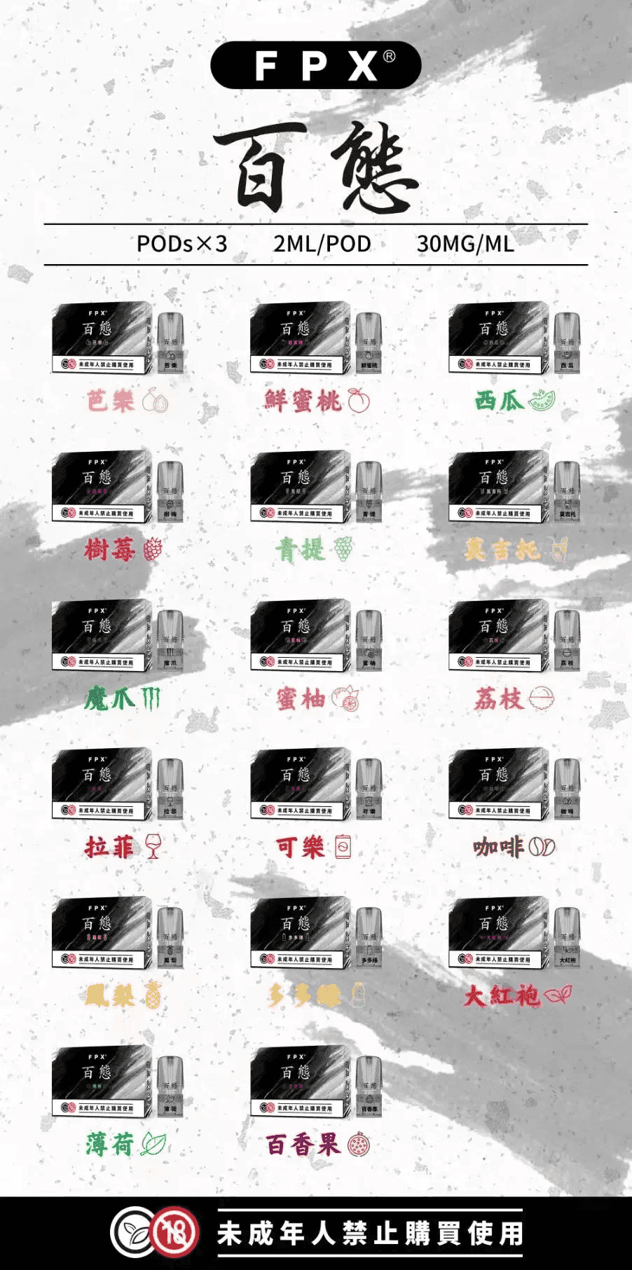 | 口味 | 芭樂, 鮮蜜桃, 西瓜, 樹莓, 青提(白葡萄), 魔爪, 蜜柚, 荔枝, 拉菲紅酒, 可樂, 咖啡, 鳳梨, 大紅袍, 薄荷, 百香果, 莫吉托 |