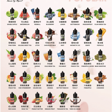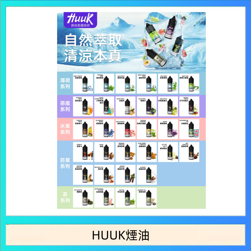 | 煙油3% | 茶系列-鐵觀音, 茶系列-白桃烏龍, 茶系列-宇治抹茶, 茶系列-茉莉花茶, 水果系列-藍莓爆珠, 水果系列-葡萄漿果, 水果系列-熱情代基裹, 水果系列-百香果汁, 水果系列-蘋果蜜桃, 水果系列-冰鎮西瓜, 薄荷系列-原味薄荷, 薄荷系列-薄荷甘露, 薄荷系列-絕對零度, 薄荷系列-深度凍結, 薄荷系列-奶香薄荷, 薄荷系列-薄荷口香糖, 惡魔系列-白魔爪, 惡魔系列-藍魔爪, 惡魔系列-原味魔爪, 惡魔系列-太平洋魔爪, 惡魔系列-壞蘋果魔爪, 惡魔系列-小熊軟糖魔爪, 煙草系列-雪茄, 煙草系列-翠貝卡, 煙草系列-摩托車, 煙草系列-堅果煙草, 煙草系列-黑星煙草, 煙草系列-經典烤菸, 煙草系列-黃油煙草, 煙草系列-旅程煙草, 煙草系列-原味菸草, 煙草系列-VCT原味黑金 |