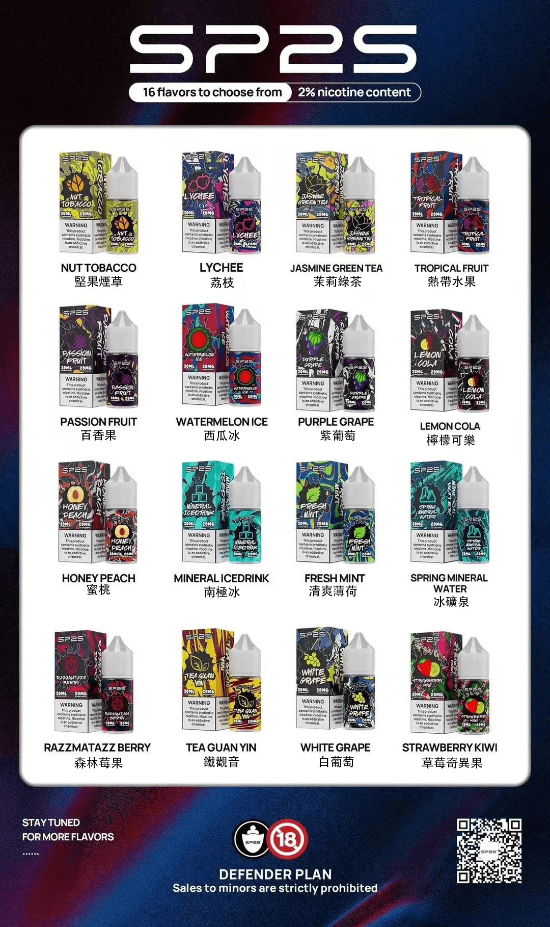 | 煙油2% | 冰碛泉, 清爽薄荷, 茉莉綠茶, 南極冰, 堅果煙草, 熱带水果, 草莓奇異果, 白葡萄, 荔枝, 檸檬可樂, 百香果, 蜜桃, 森林莓果, 紫葡萄, 西瓜冰, 鐵觀音 |
